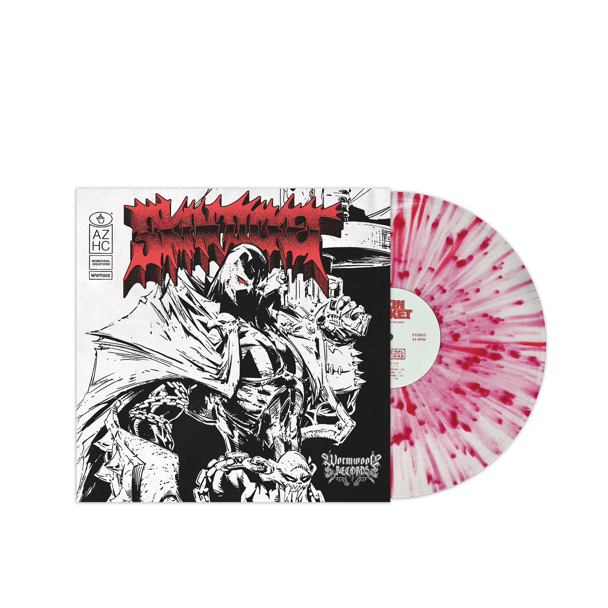 The band wanted to do a blood splatter type vinyl, which of course I was on board with! The vinyl is a milky clear base with heavy red splatter!! Photos are just mockups and will not look exactly as shown.